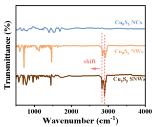 Dalam spektrum FT-IR SNW Cu9S5 seperti yang ditunjukkan pada Gambar 3, fenomena pergeseran merah yang signifikan diamati dibandingkan dengan Cu9S5 NWs, menunjukkan interaksi elektronik antara Cu dan S. Puncak karakteristik sampel Cu9S5 NWs dan Cu9S5 SNWs pada 2916 cm-1 dan 2846 cm-1 dapat dikaitkan dengan mode getaran regangan metilen (-CH2-) pada dodekanetiol, sedangkan puncak karakteristiknya pada 1471 cm-1 sesuai dengan mode getaran lentur ikatan C-H.