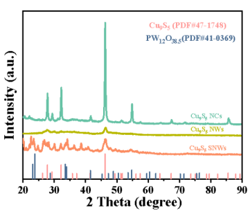 Lebar setengah puncak bidang kristal Cu9S5 SNWs (001) secara signifikan lebih besar dibandingkan dengan dua bentuk sampel lainnya. Menurut rumus Scherrer, semakin kecil ukuran butir, semakin besar setengah lebar puncak puncak difraksi. Sebaliknya, semakin besar ukuran partikel, semakin tajam separuh lebar puncak difraksi. Karena ukuran sampel SNW Cu9S5 skala sub nanometer (0,95 nm) dan fakta bahwa sampel menunjukkan struktur sel tunggal tanpa bidang kristal lengkap, lebar setengah puncak secara signifikan lebih besar, sedangkan lebar setengah puncak (001) SNW Cu9S5 lebih tinggi.