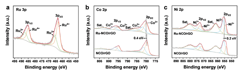 Teknologi XPS dapat menganalisis secara mendalam komposisi unsur, keadaan kimia, dan struktur elektronik permukaan katalis. Ketika permukaan katalis disinari dengan sinar-X, elektron-elektron atom permukaan tereksitasi. Dengan mendeteksi energi dan kuantitas fotoelektron tersebut, kita dapat menentukan jenis dan kandungan unsur, serta lingkungan kimia di mana unsur tersebut berada. Misalnya, ketika mempelajari katalis logam pendukung, XPS dapat secara akurat menentukan bentuk logam pada permukaan pendukung, apakah itu unsur logam atau oksida logam, dan perubahan bilangan oksidasinya. Hal ini sangat penting untuk memahami aktivitas dan mekanisme penonaktifan katalis. Seperti yang ditunjukkan pada Gambar 5, XPS digunakan untuk menunjukkan komposisi dan keadaan valensi unsur Ru, Co, dan Ni. Spektrum halus XPS dari unsur-unsur tertentu dalam sampel digunakan untuk menentukan pergeseran energi pengikat positif/negatif, yang menunjukkan adanya interaksi elektronik.
