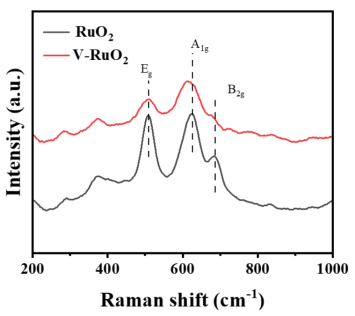 Seperti yang ditunjukkan pada Gambar 4, spektrum Raman dari V-RuO2 (RuO2 yang didoping V) konsisten dengan spektrum RuO2, tanpa puncak unik lainnya, kecuali pembentukan V2O5. Doping V menggeser mode A1g RuO2 ke bilangan gelombang yang lebih rendah, menunjukkan bahwa masuknya V secara signifikan mempengaruhi struktur kisi dan lingkungan ikatan kimianya (yang dapat mengakibatkan kekosongan oksigen atau cacat lokal), sehingga mengubah struktur elektroniknya; Pergeseran ke kiri puncak A1g mencerminkan interaksi antara atom V dan kisi RuO2, menunjukkan bahwa doping V memodulasi simetri lokal dan karakteristik panjang ikatan RuO2.